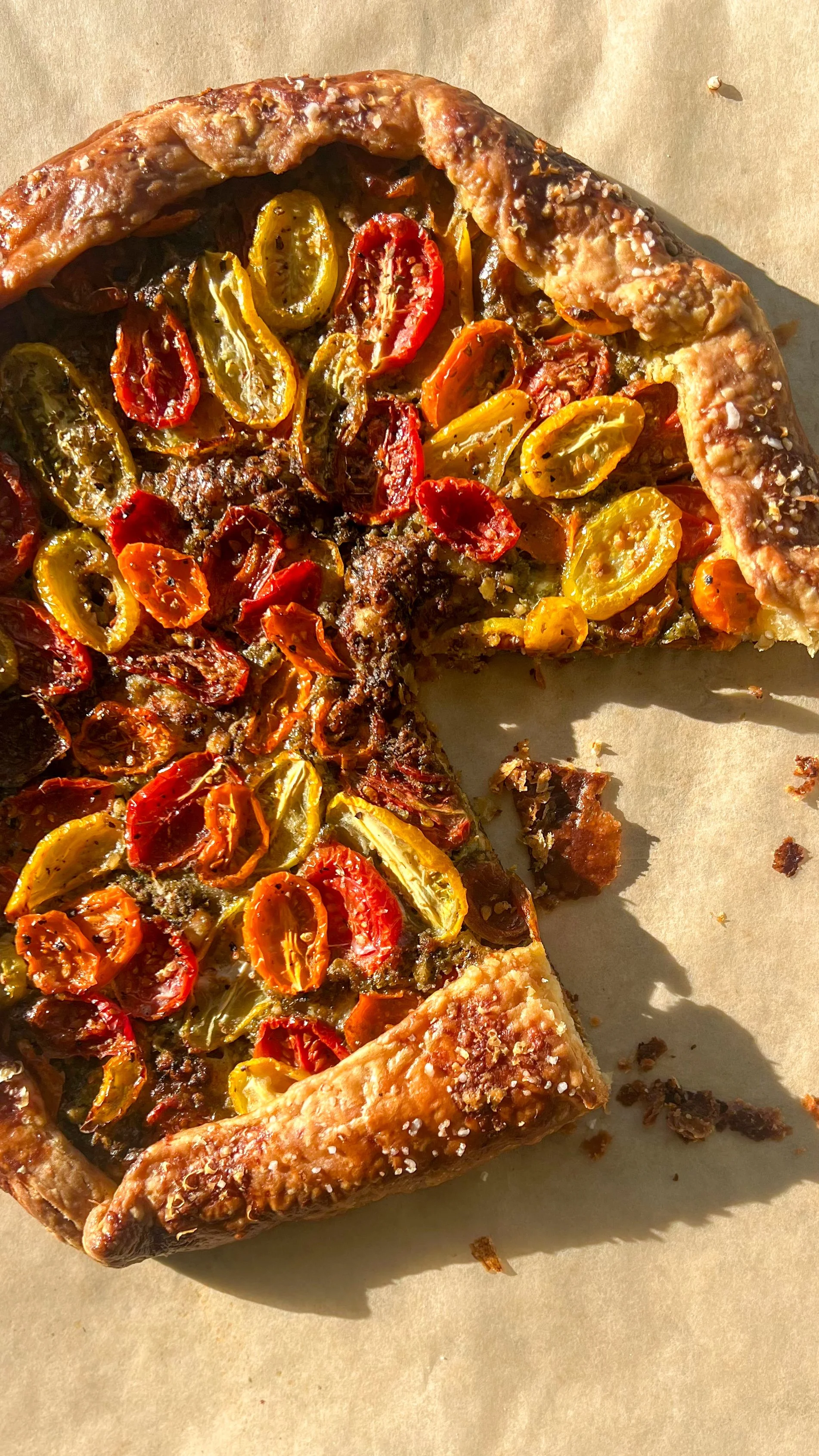 Golden, rustic tomato pesto galette — flaky crust, juicy tomatoes, and a layer of basil pesto that tastes like summer in every bite.