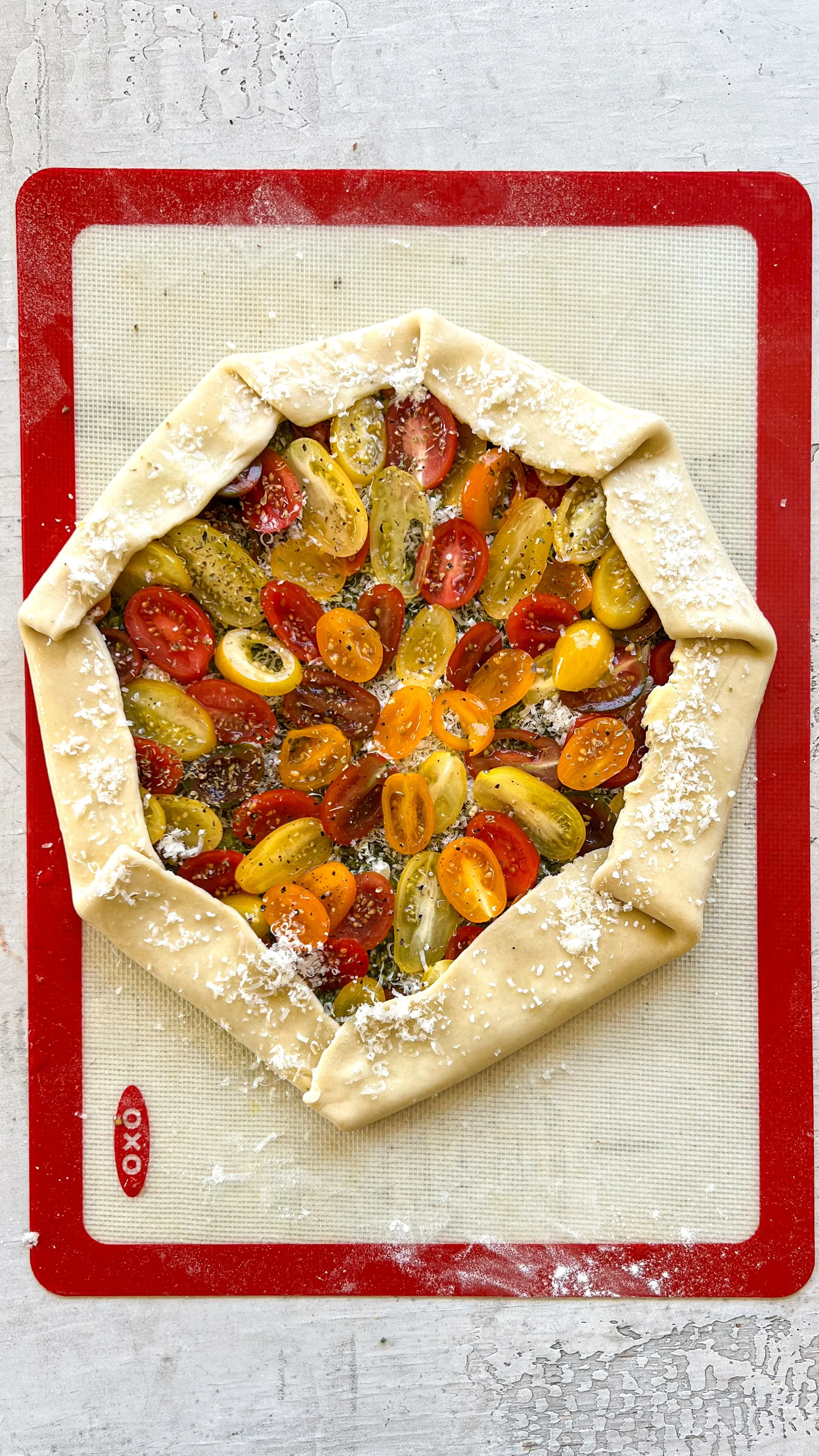 Spoon roughly ¼ cup of basil pesto into the center of the rolled-out dough, leaving a 1–2 inch border around the edges. Scatter 1½ cups of shredded Parmesan over the pesto, then arrange the tomato slices in an even layer on top.