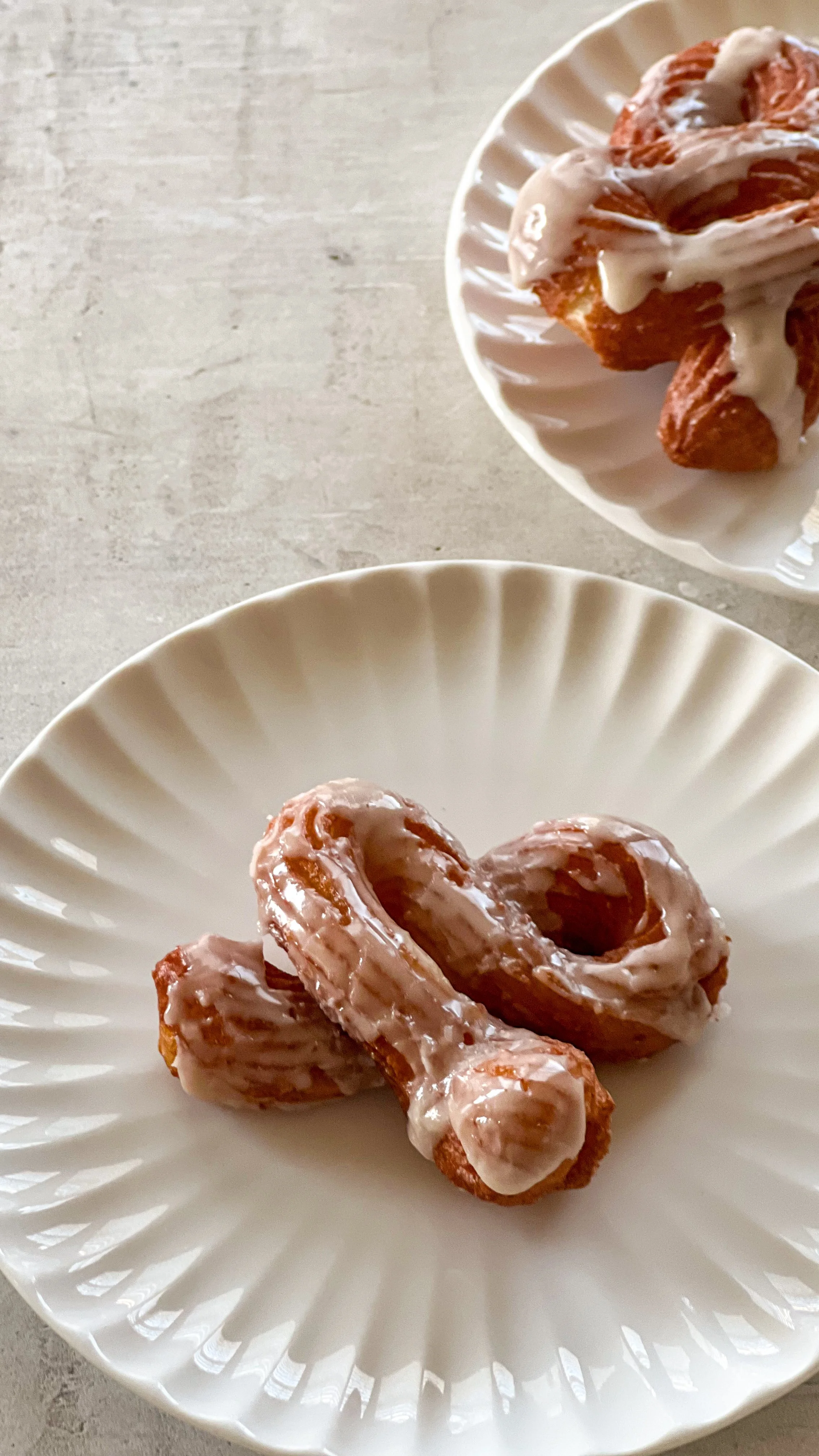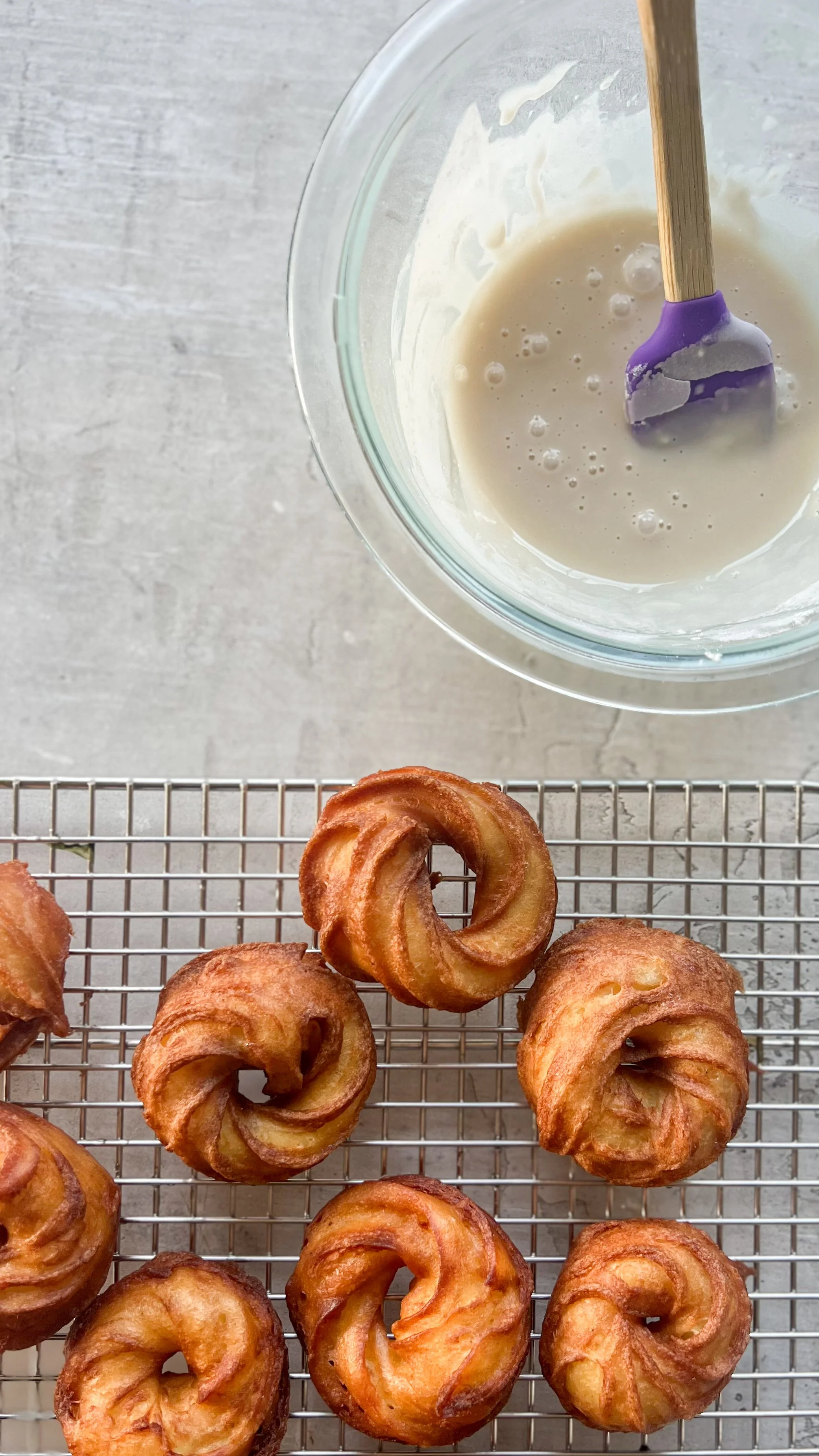 Crisp on the outside, impossibly light within, these vanilla crullers are a study in contrast. The dough begins as a classic pâte à choux, cooked briefly on the stovetop, then piped into delicate rings that puff dramatically when they hit hot oil. A quick dip in glaze while still warm gives them their signature sheen and sweetness.