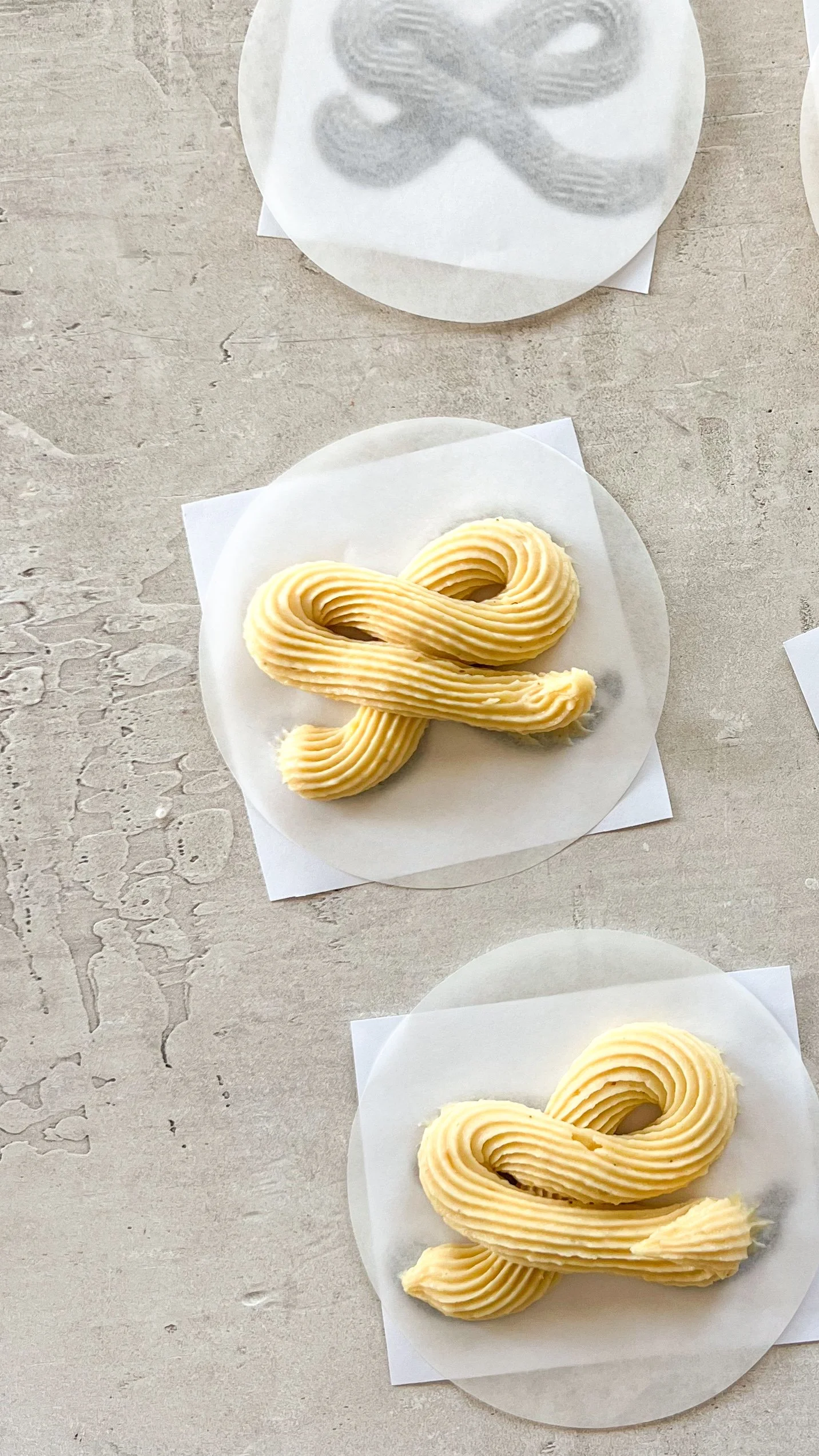 Cut parchment into small squares. Pipe chilled dough into connected rings on each square using a large star tip.