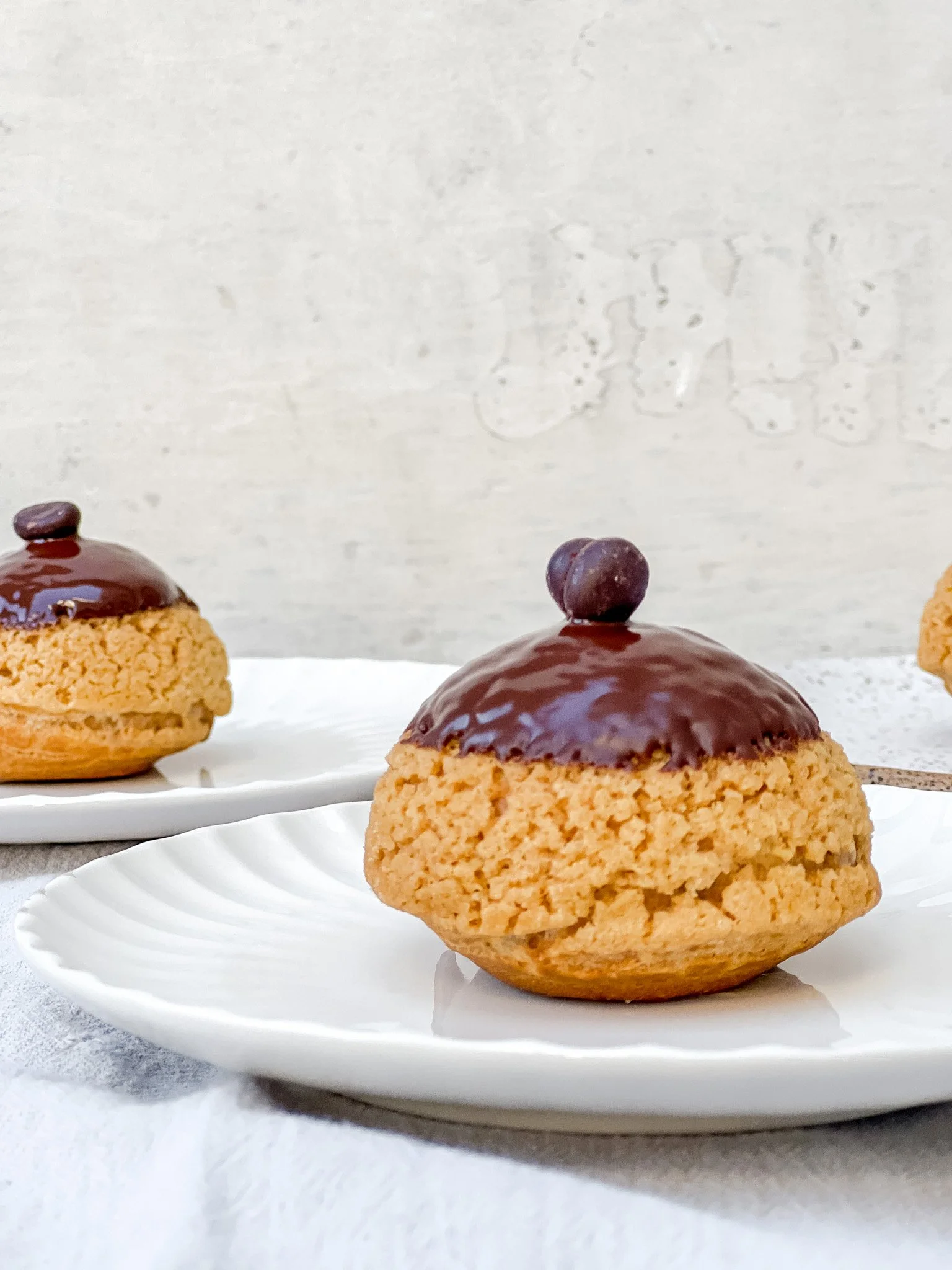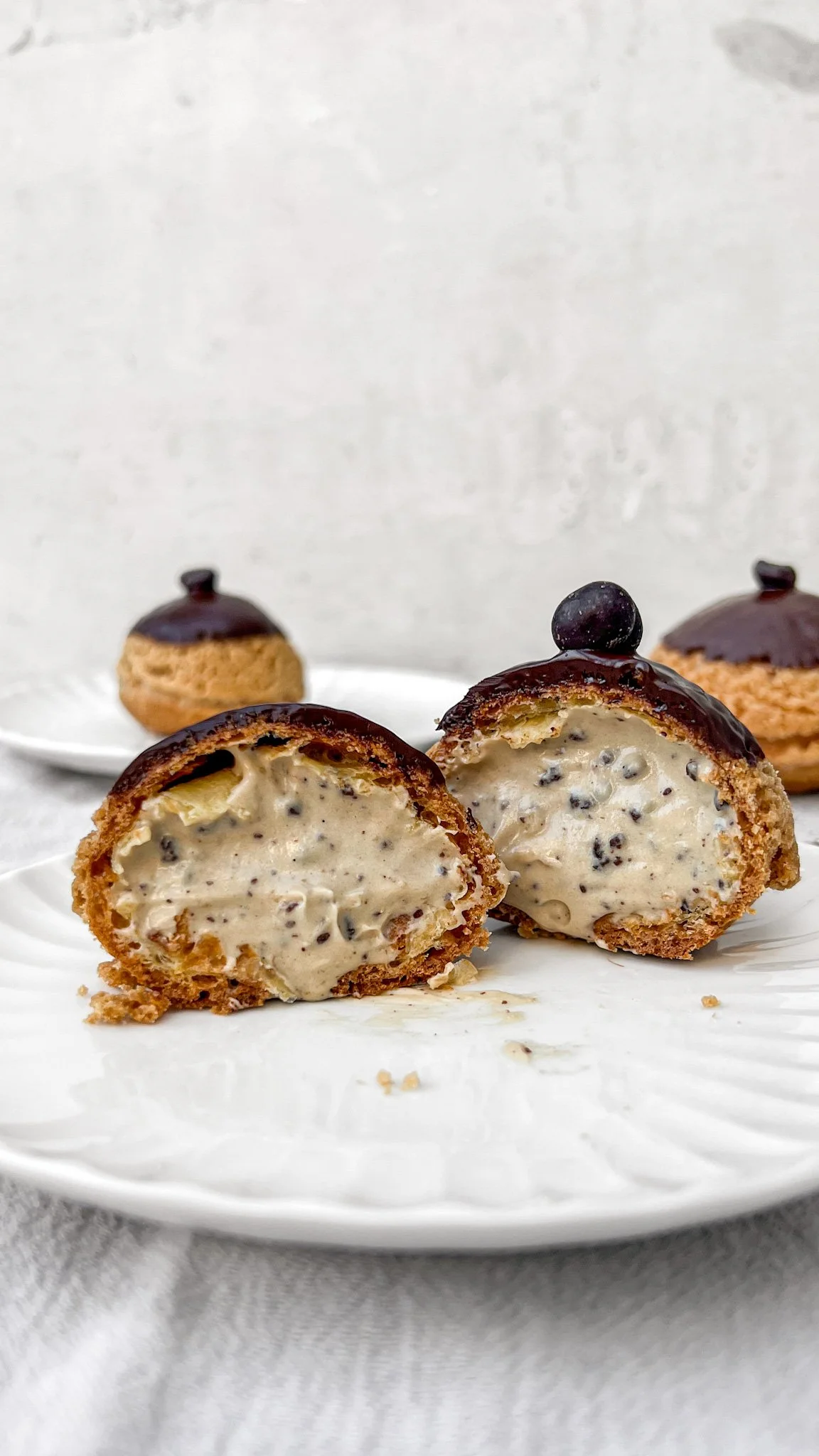 These cream puffs borrow all the best parts of tiramisu — the espresso, the mascarpone, the chocolate — and tuck them inside a golden shell capped with craquelin, that buttery cookie lid that bakes into a delicate, crackly crust. The filling is a velvet-smooth custard folded with white chocolate and mascarpone, lightened with whipped cream and speckled with dark chocolate for texture. Bite through the crisp top and airy pastry and you’re met with layers of coffee, cream, and crunch — all the familiar comfort of tiramisu, reimagined in a single, handheld puff.
